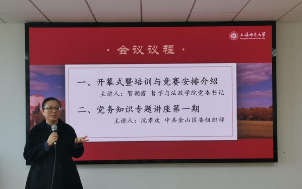 开幕式结束后是第一期培训活动。第一期培训活动邀请到中共金山区委组织部沈孝欢老师进行党务实务工作分享。沈孝欢老师从党务工作概念介绍引入,给同学们辨析了党务工作、党的建设、党的工作等概念。随后,沈老师采用文本讲授、案例教学和视频教学等方式,着重介绍了党的组织体系设置、党员发展工作、党的组织生活制度、党费缴纳与管理、党徽和党旗使用规范等实务工作。