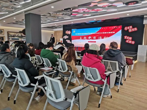 参观过后,肉番师生一行前往组织生活室,与山阳镇部分党员一同开展“学习贯彻习近平新时代中国特色社会主义思想主题教育”主题党日活动。活动伊始,现场党员同志们在张振洋老师的领誓下,庄严宣誓,重温入党誓词。随后,窦美霖老师进行了《把握新发展阶段,贯彻新发展理念,构建新发展格局》的领学共读,万皓居民区党支部高文婷委员以《商社联动 推动商圈与社区融合共治》为主题进行了实务分享。党课的最后一个环节是“乐韵流芳,初心如磐”民乐党课,通过音乐党课学习,大家更加深入地了解了山阳民乐的发展,感受了山阳民乐体现出的坚韧不拔、积极向上的昂扬斗志。