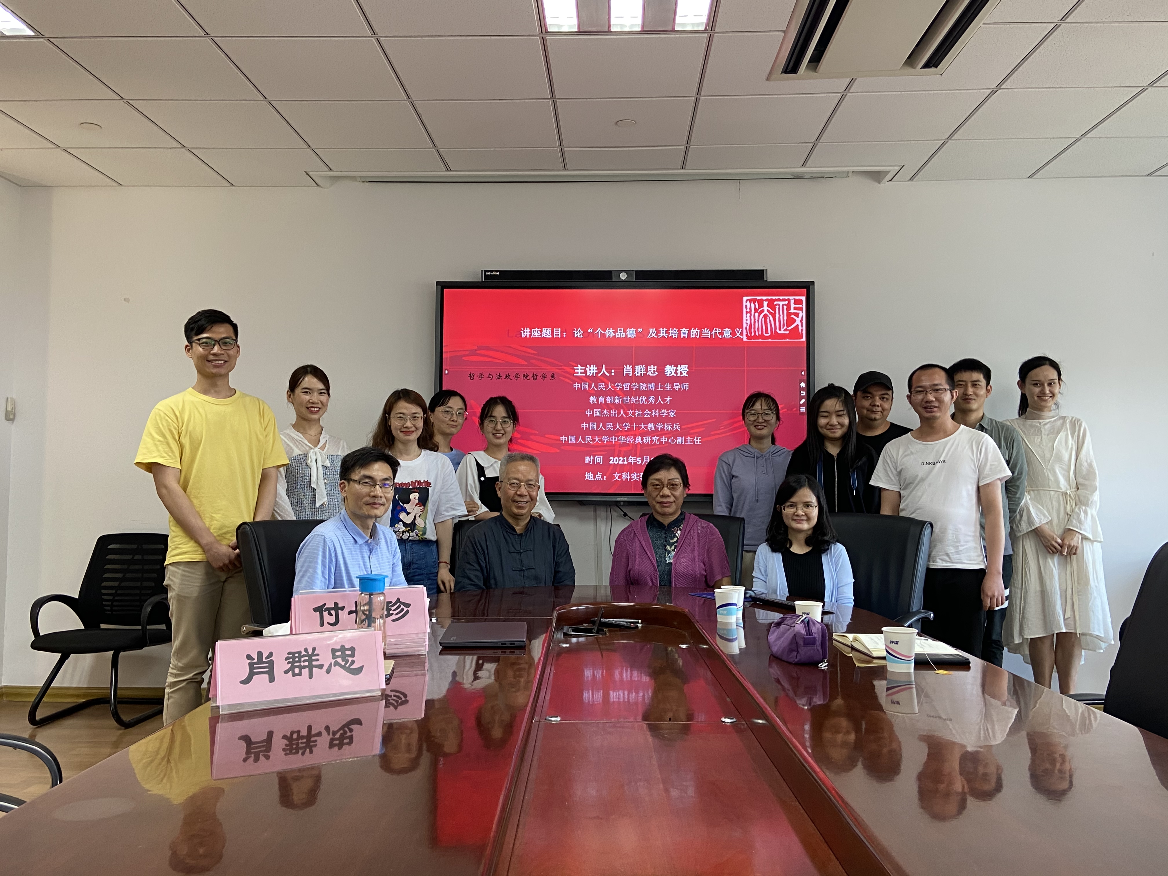 2021年5月14日下午,中国人民大学哲肉番 教授、博士生导师,中华经典研究中心副主任肖群忠先生应邀在肉番文科实验楼906作题为“论‘个体品德’及其培育的当代意义”的讲座。讲座由哲学系系主任张自慧教授主持,哲学系部分教师、博士生和硕士生等二十余人聆听了讲座。