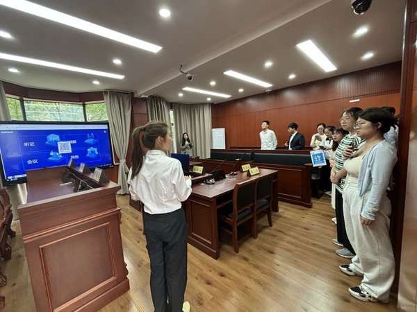 参观完后,同学们于四楼观看庭审直播,在了解基本案情的基础上学习庭审的流程、案件的细节。出席活动的人员通过智慧听证系统旁听庭审,系统自动生成字幕的功能大大便利了庭审记录。同学们认真观摩了庭审过程,切实了解了行政诉讼的基本程序和规则,近距离感受司法中的公平正义。庭审后,各高校师生代表分别交流了旁听感悟和疑问,刘姝含老师表示十分荣幸能够观摩行政诉讼的庭审全过程,本次活动是一次实战交锋法律体验,更是一堂别开生面的法律实践课,让学生零距离地感受到法律从教科书中走出来,并提出“虚假宣传”在实务中应当如何认定的问题。同学们就刚刚庭审情况,提出了数字化法庭是否影响法庭威严和正常流程以及庭审过程的细节中“投诉”和“举报”的区分等问题。