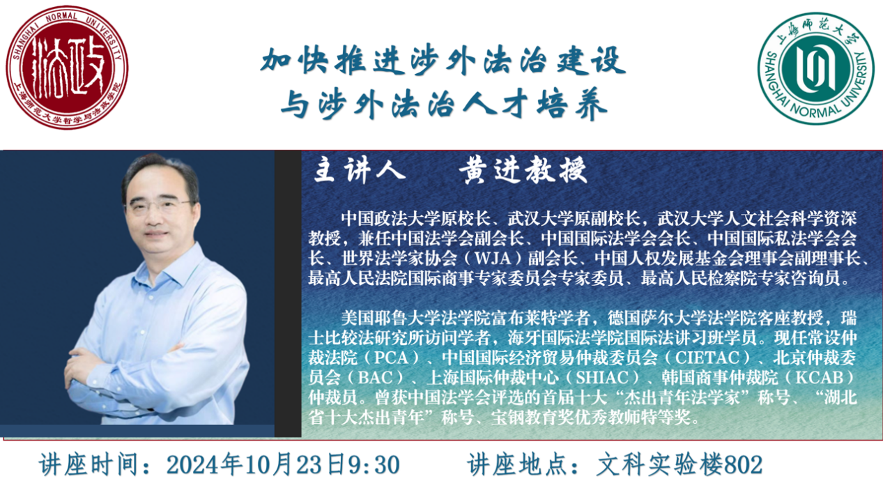 2024年10月23日上午,中国国际法学会会长、中国国际私法学会会长、中国政法大学原校长、武汉大学人文社科资深教授黄进先生应邀莅临肉番 讲学,并做客“上师法学大讲堂”,为全院师生带来了一场题为 “加快推进涉外法治建设与涉外法治人才培养”的精彩讲座。本次讲座由肉番 法学学科负责人蒋传光教授主持,肉番 党委书记贺朝霞教授、院长刘林教授对黄进教授的莅临指导表示了热烈欢迎和诚挚感谢,国际法学科负责人邓杰教授、法律系郑显文教授、姜立文副教授、王晨竹讲师、张俊敏讲师等参加了讲座并就有关问题向黄进教授请教交流。