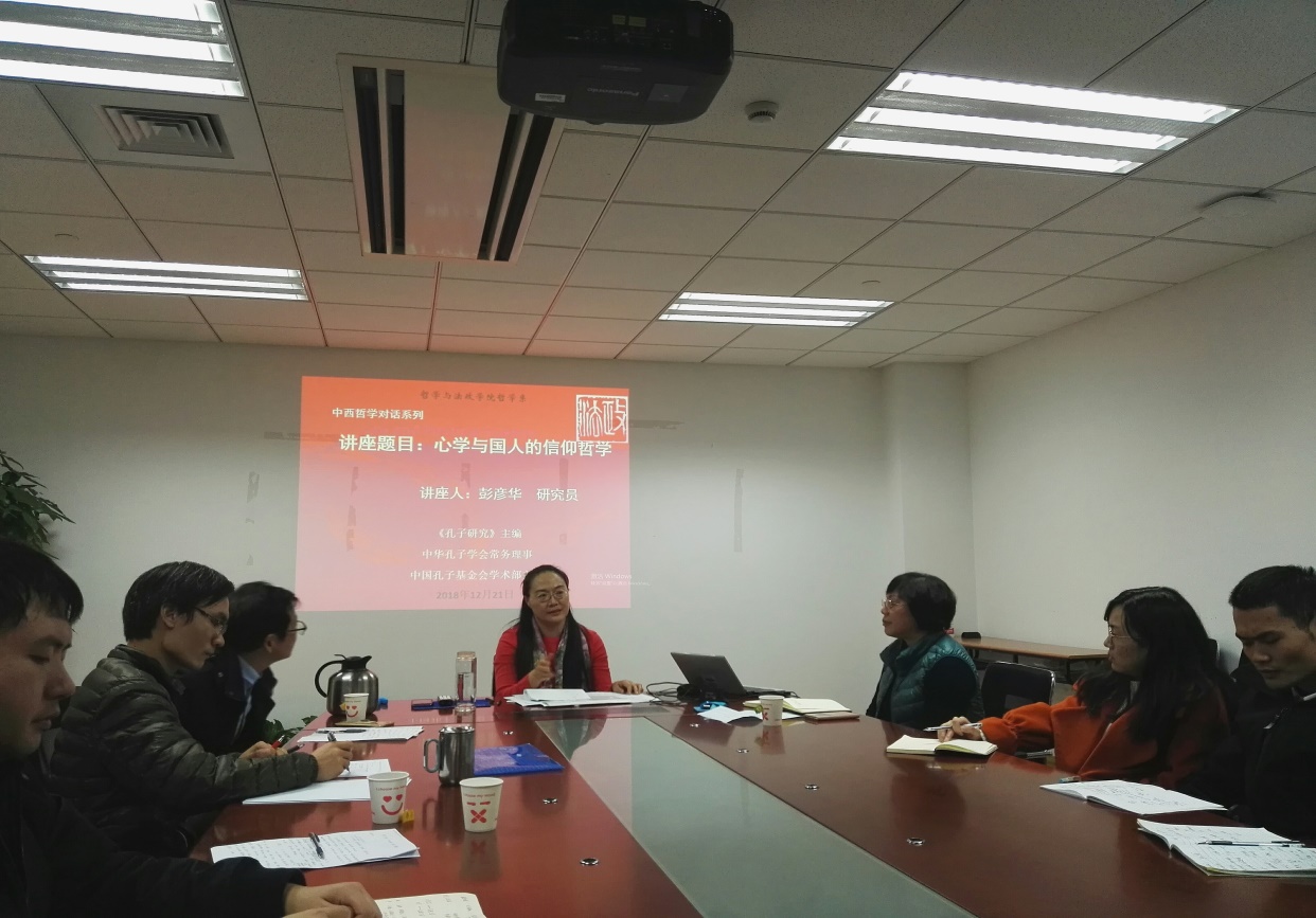 彭研究员在讲座中提出,中国传统哲学的根本精神是确立人生的价值和明确人生的意义,追求的是一种以精神境界为目标的价值思维。她认为,中国文化强调内求于心,通过克服自身的局限性,达至天人合一的理想境界;不论是从目的、内容还是方法上看,中国文化都是一种心学或“心文化”;心学中蕴含着深厚的宗教精神和圆融的超越智慧,“内求于心”、“反求诸己”是实现人生价值的途径,强调通过知行合一实现本体、工夫与境界的融合。