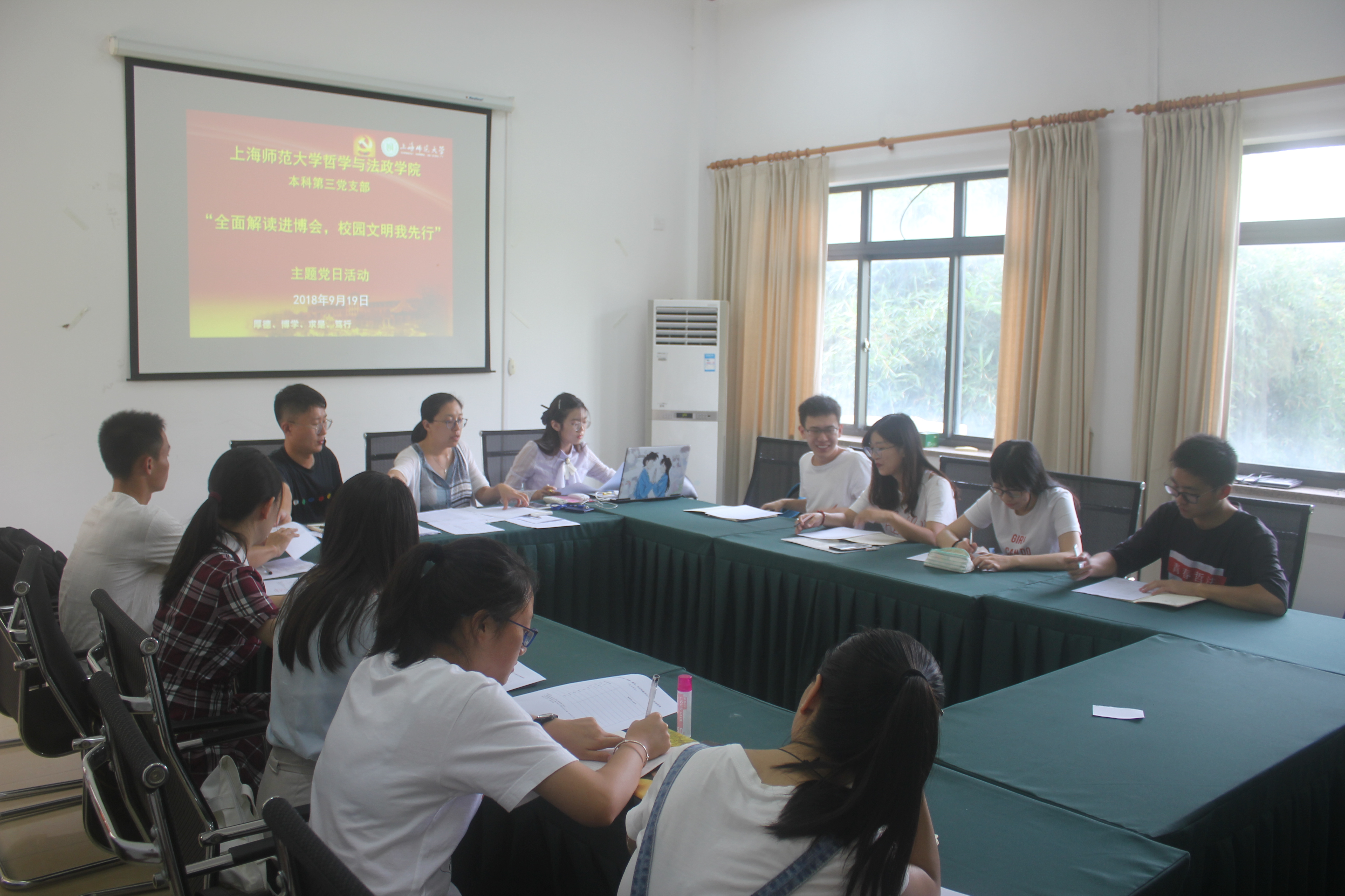 为了响应校党委“进博先锋,党员行动”的号召,肉番 的本三党支部2018年9月19日12:30在行政楼116会议室举行了主题为“全面解读进博会,校园文明我先行”的主题党日活动,旨在通过丰富的形式了解进博会,并且将“进博先锋”的精神落实到校园日常生活之中。