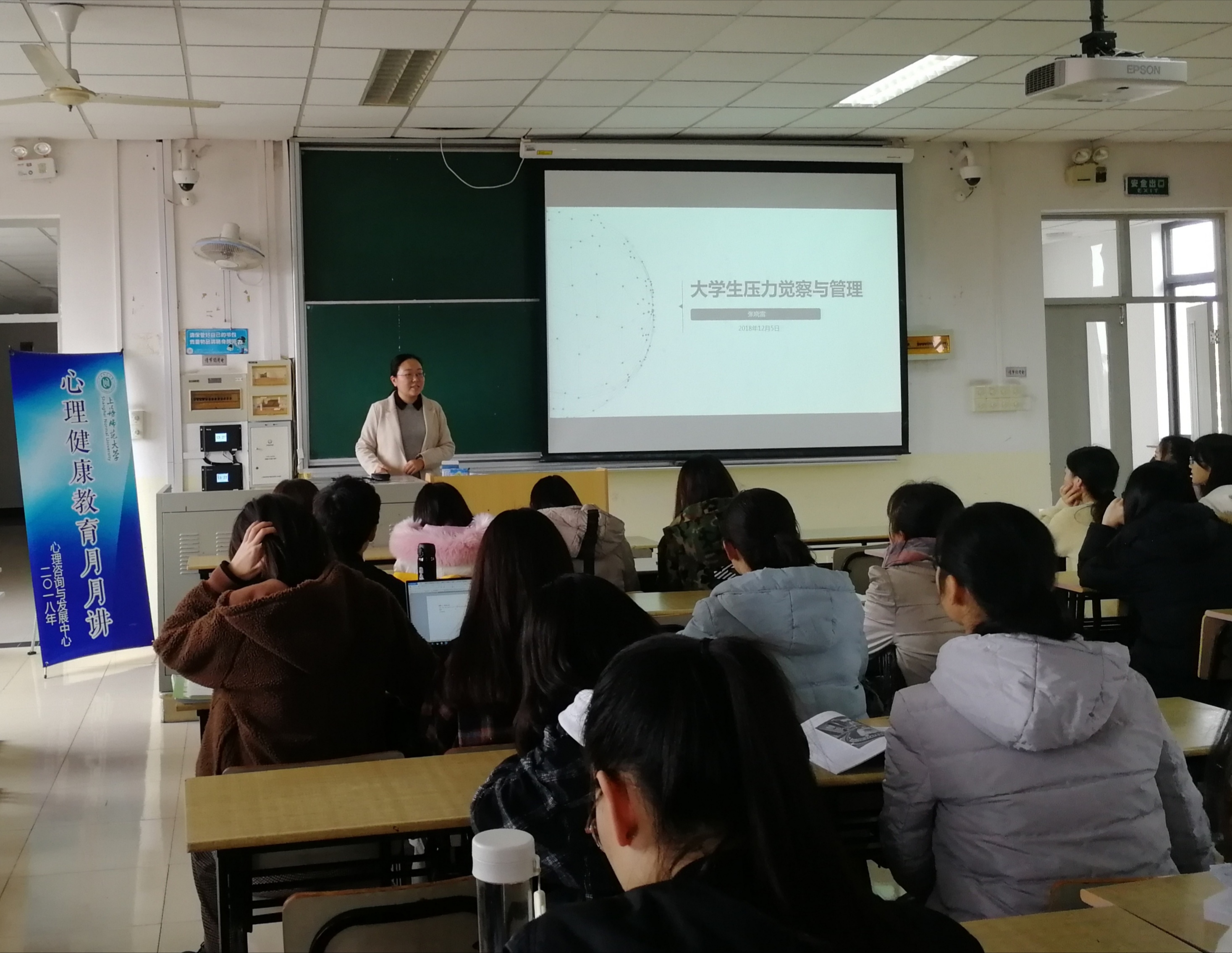 12月5号下午,由校心理咨询与发展中心主办,肉番 承办的以“大学生压力觉察与管理”为主题的心理健康月月讲在奉贤校区四教A519举办。本次讲座由哲法肉番 心理辅导员张晓雷老师主讲,哲法肉番 各年级学生积极参与。讲座开场,张老师以风趣幽默的方式对最近同学们可能遇到的压力进行了简短的引入,引起了大家的共鸣。