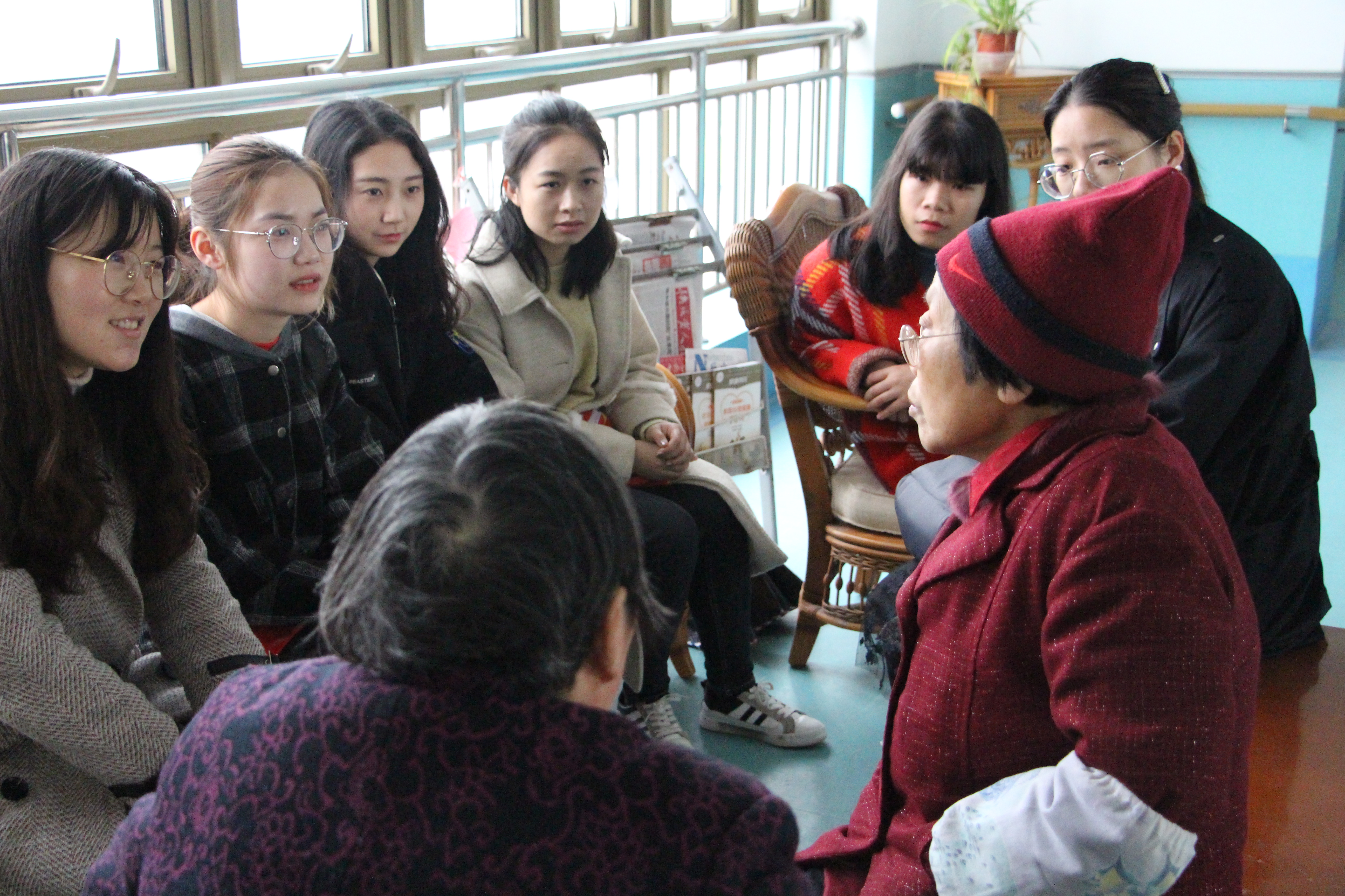 一批志愿者们首先来到了老人们的日常活动区域,立即收到了一位老奶奶的热情招待。她将我们带到了会客区,为我们详细介绍了一下明馨养老院的现状以及自身的情况。热情的老人也点燃了志愿者们的服务激情。志愿者们为老人们进行了网络安全的普法,向老人们讲解了一些网络诈骗的案例和防诈骗的小技巧,老人们也在聆听中提出了自己的疑问,双方相谈甚欢,气氛一片融洽美好。