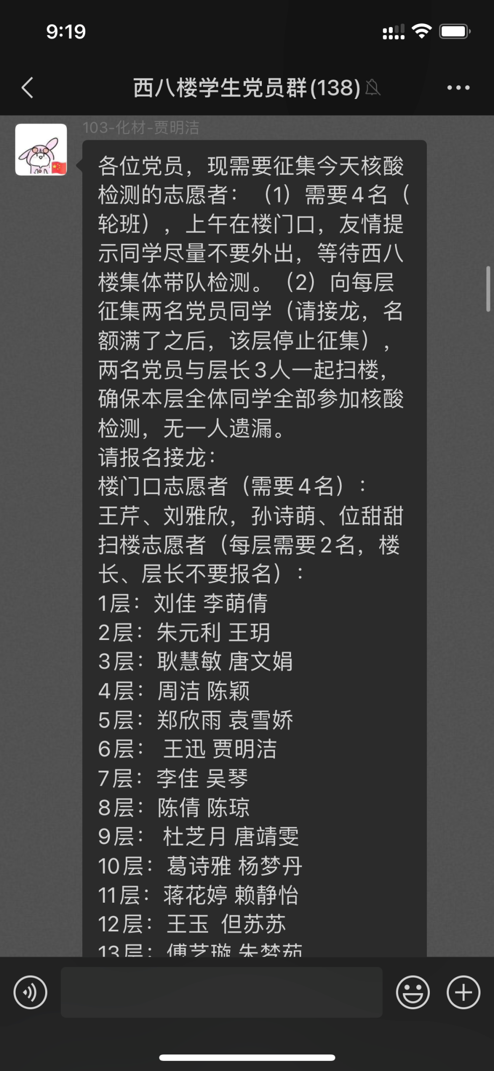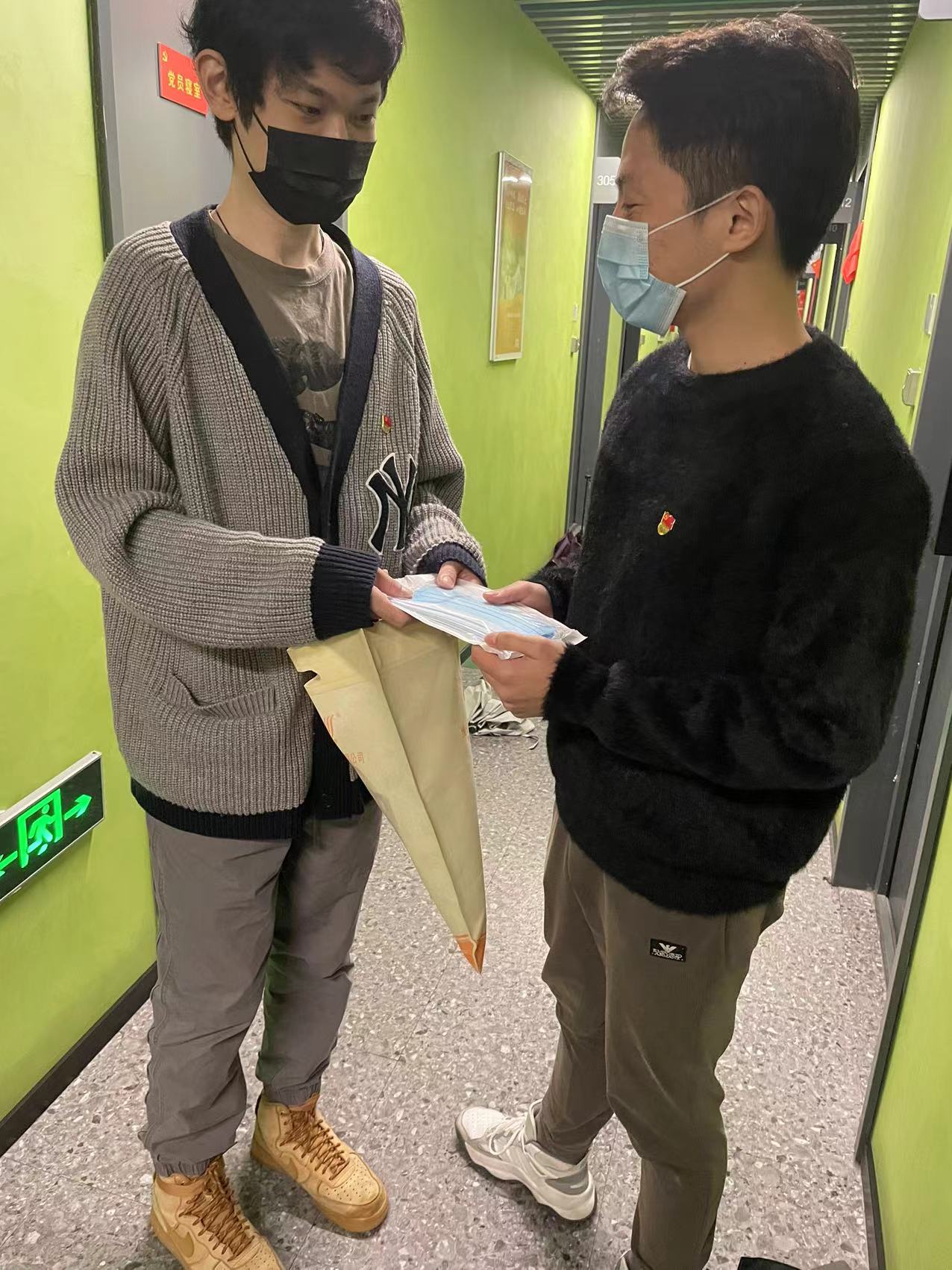 两位同志收到老师特意“快递”过来的口罩后,随即在微信群里通知“口罩到达东部”。得益于肉番 党员管理日常的组织性和高效率,两位同志非常熟悉同志们的寝室情况,第一时间到达同志们所在的楼层,一扇扇门敲开,一沓沓口罩递进去。微信群里、宿舍门前,一声声一句句“谢谢”“应该的”,串成初春动人的乐章。