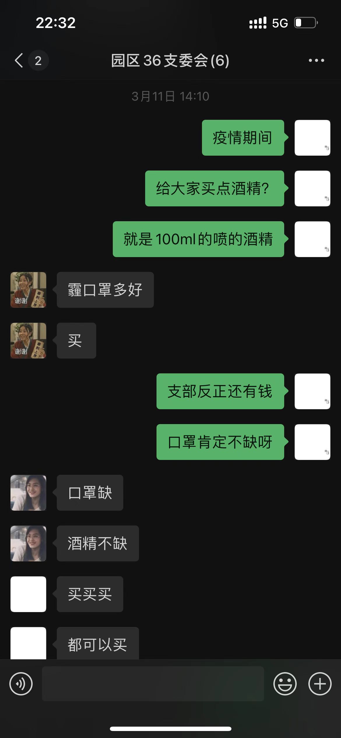 “大家最近有需要的物资吗?”支部书记陈睿统计了手头支部的经费,在群里问道。口罩、消毒液、洗手液……大家结合自身需要,一件一件地往群里报。有限的经费要尽可能覆盖到支部共计24名党员,最好还能发挥支部的堡垒作用,照顾到发展对象、积极分子,和一心靠近党组织的群众们。根据实际需要和经费情况,支委决定首先给每位党员发放口罩,打造隔离病毒的第一道防线。