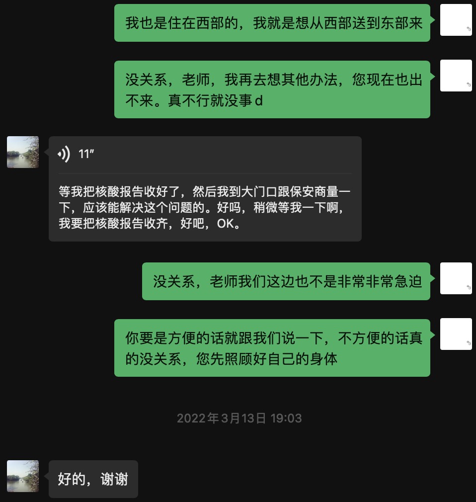 物资经过下单、配送,到达上师大西部校区时,学校已经执行了严格的准闭环管理,西部的物资无法传递到东部校区同志们的手中。西部校区的党员在很快领取到口罩;居住在东部校区的部分名党员,可能就要隔着一道街与口罩相望了。陈睿在微信群里一遍遍给大家道歉,大家则安慰他,疫情瞬息万变,能够理解这种不便。
