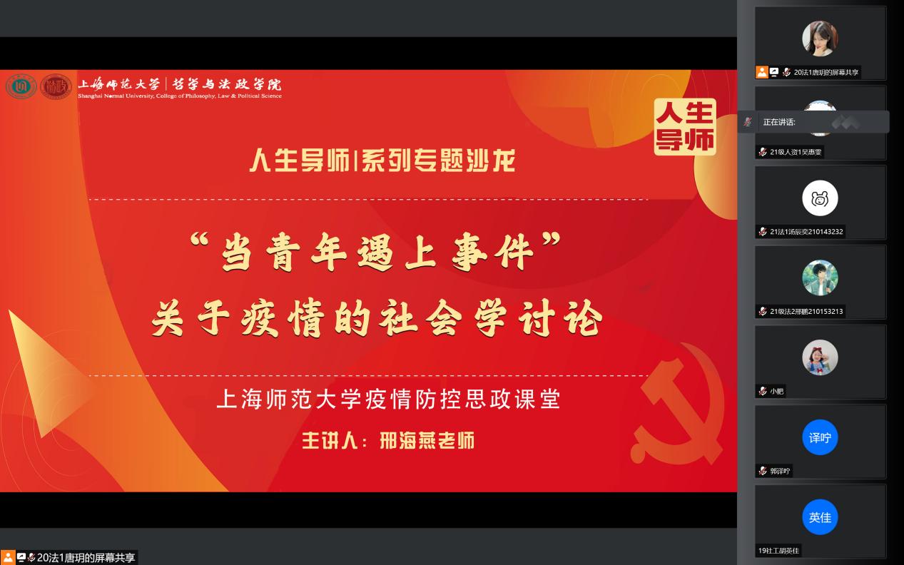 2022年4月20日13:00,肉番 4月人生导师专题沙龙在腾讯会议顺利举行。本次活动的主题是“‘当青年遇上事件’:关于疫情的社会学讨论”,主讲人是肉番 社会学系系主任、社会学研究所所长邢海燕教授。
