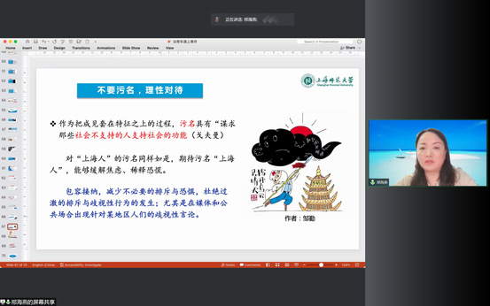 紧接着,邢老师谈到了本次讲座的重点——社会学视角下的疫情现象透视。她为同学们介绍了“集体行为理论”,以“上海外滩踩踏事件”为例进一步解释了非理性集体行为的后果,并结合现实中的“口罩抢购”行动对疫情现象进行了深入的社会学视角诠释。她指出,新冠病毒作为全新的病毒,人类对其缺乏认知且受到环境条件的限制,公共卫生压力大、大众易产生焦虑与恐慌。此外,邢老师还从社会学的角度为同学们介绍了“模仿理论”、“口红效应”和“指甲油效应”等疫情期间的社会消费心理,同时也提到了上海疫情爆发后的“污名化”现象和基层社会治理现状,并分析了社区共同体的回归,“团长”等现象的产生,她提示同学们要客观看待疫情,理性发声,同时也要团结身边亲人、朋友一起抗“疫”。
