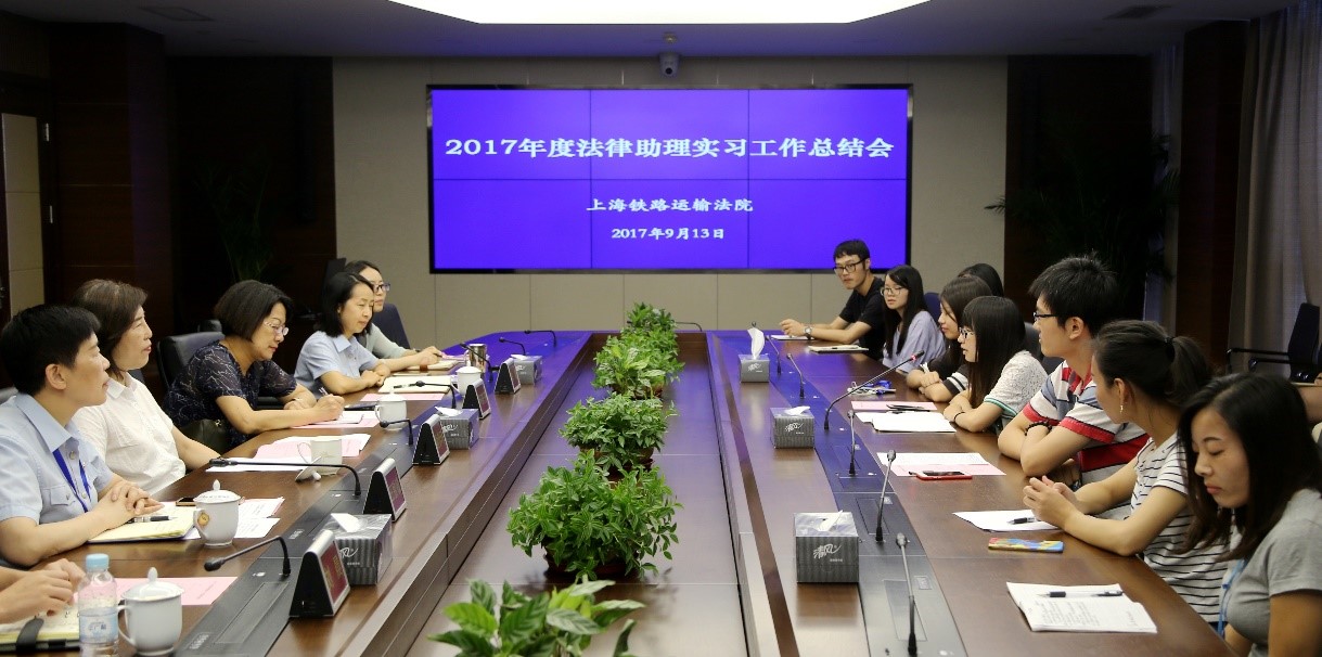 2017年9月13日下午4时,上海铁路运输法院(以下简称“上铁法院”)于1号楼4楼党组会议室召开法律助理实习工作总结会。上铁法院党组织书记、院长俞秋玮,政治部主任陈雷、立案庭庭长王敏敏、破产庭副庭长刘晨到会,肉番 法律硕士中心主任环建芬老师与本次我校全体上铁法院的法律硕士实习生一同参加了会议。会议由陈雷主任主持。