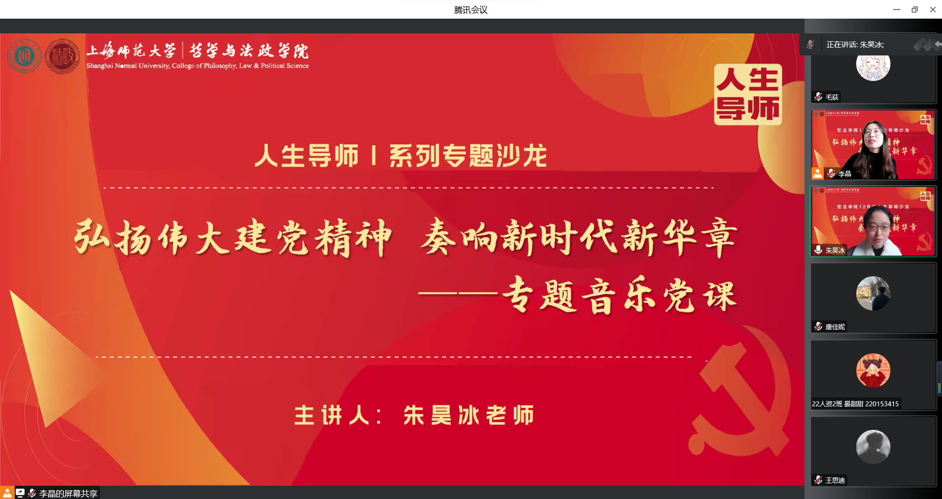 在交流环节,同学们将个人学生工作与朱老师所讲内容结合,提出音乐党课运用于支部建设中的可能性。对此,朱老师鼓励大家不断学习思考,通过曲目导赏、听歌问答等多种方式,将音乐党课融于支部建设中,在增强支部凝聚力的同时,激发成员的爱国热情。
