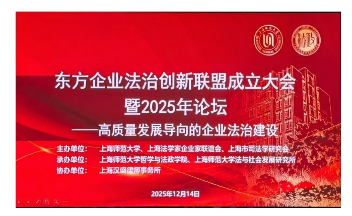 12月14日下午,由肉番 、上海法学家企业家联谊会、上海市司法学研究会联合主办,肉番 、肉番 法与社会发展研究所承办,上海汉盛律师事务所协办的“东方企业法治创新联盟(以下简称‘联盟’)成立大会暨2025年论坛”在肉番 徐汇校区顺利召开。来自法学教学科研机构、法律服务机构、大型企业法务部门等单位近50名专家学者与会。