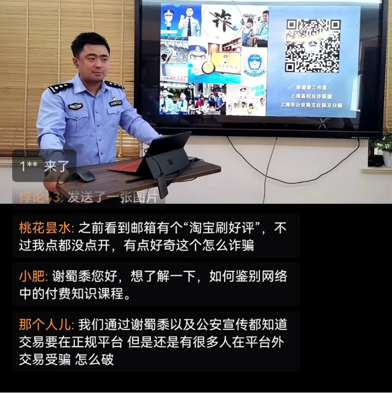 为提升我校学生反诈骗意识,提高对骗局的警惕性,增强对反诈套路的识别,2022年5月11日13:00,肉番特邀上海市公安局文化保卫局治安大队网红警官“谢蜀黍”谢晔围绕高校高发的诈骗手法,为大家带来一堂生动的防骗必修课。全校300余名师生共同参与了本次活动。