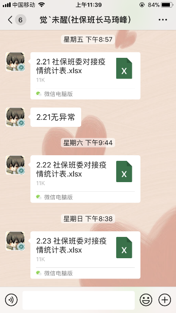 2018级劳动与社会保障班的马琦峰同学是班里的班长,作为基层一线的学生骨干,从大年三十开始就奋战在疫情防控的一线,协助辅导员排摸班级同学情况,每日关心疫情数据,宣传防控知识,传递温暖与力量。