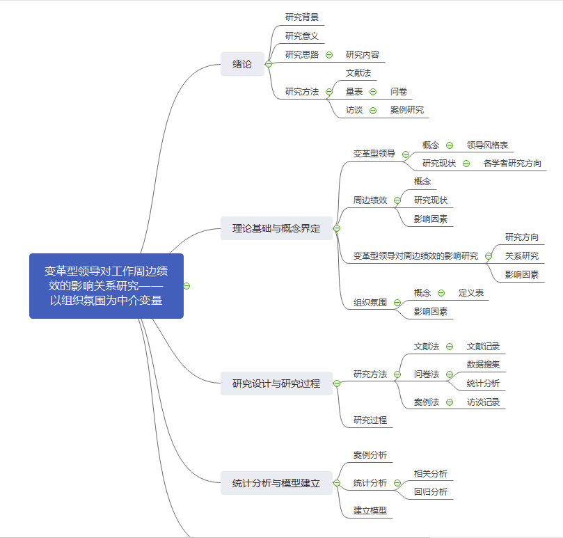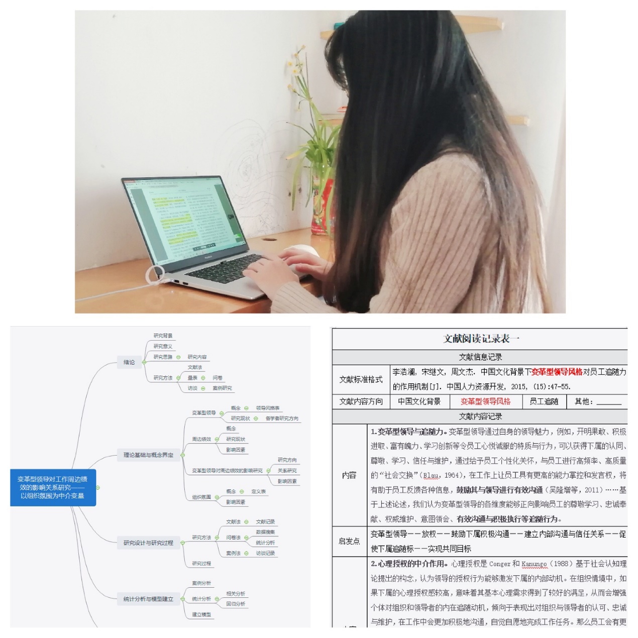 写作过程抽丝剥茧充分利用信息化工作。撰写文献综述时,主要在网上下载了人力资源管理和管理世界的文献,了解最新方向。结合知网看文献,做文献记录;结合曾经过的研究方向、最新的文献思考点,不断缩小选题;接着,根据选题利用便捷的“思维导图”工具做简易提纲,看具体方向的文献,与论文导师商量分析研究可行性。最后,使用MindMaster制作简易论文提纲,了解需要搜集的资料,形成雏形框架,为后续论文内容补充搭建完善的框架。