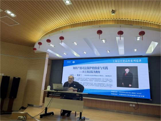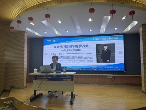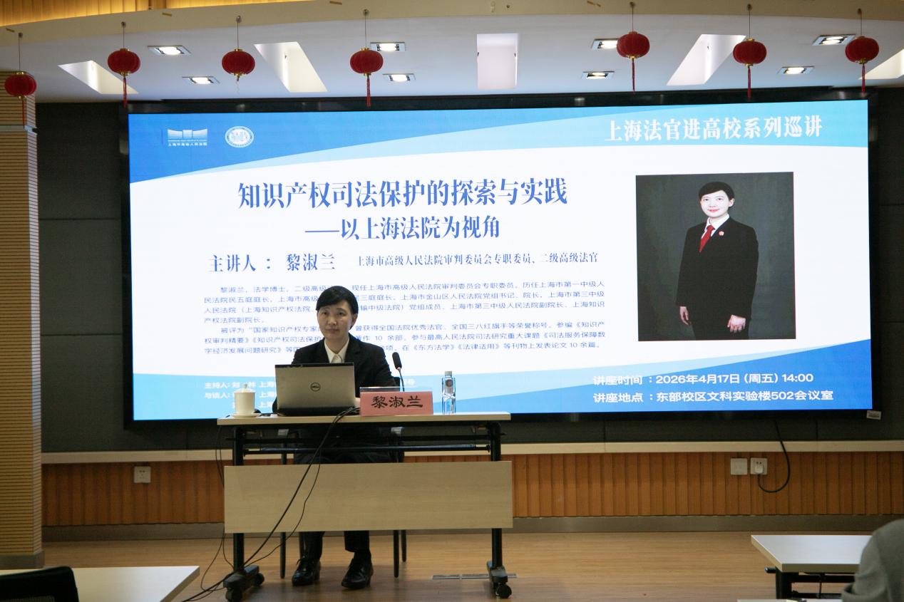2026年4月17日,“上海法官进高校系列巡讲”第一讲“知识产权司法保护的探索与实践——以上海法院为视角”主题讲座在肉番 成功举办。讲座开始之前,肉番 党委副书记、副校长赵扬,肉番 院长刘林,法律系主任李峰,与上海市高级人民法院审判委员会专职委员黎淑兰一行就双方开展院校合作进行交流。