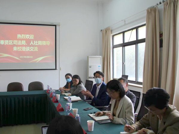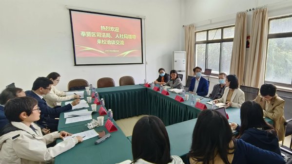 2023年4月26日15:30,奉贤区人社局党组成员、副局长王明伟,奉贤区司法局党委委员、副局长沈勇忠,奉贤区人社局事业单位管理科科长徐菊英,奉贤区司法局政治处主任张燕,奉贤区司法局矫正科科长徐皇美,奉贤区思齐社会工作服务中心总干事顾勤华来肉番就奉贤区思齐社会工作服务中心应届毕业生招聘事项展开洽谈。肉番 院长蒋传光,肉番 副书记、副院长姚秋磊,学生职业发展与就业指导中心就业指导科科长严雯丽,肉番 辅导员张欣、祝楠共同出席会议。