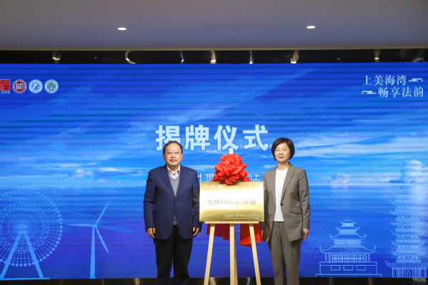 奉贤区委政法委副书记、区禁毒办副主任陆冬杰与区信访办副主任宋春艳为肉番 海旅“灋小宣”志愿服务队授旗。海湾旅游区党工委副书记、管委会主任姚红与蒋传光院长共同为肉番 “七棵树灋灋驿站”揭牌。